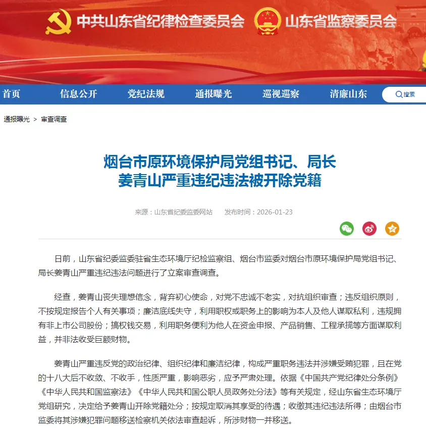 2026年1月,山东省纪委监委驻省生态环境厅纪检监察组、烟台市监委对烟台市原环境保护局党组书记、局长姜青山严重违纪违法问题进行了立案审查调查。