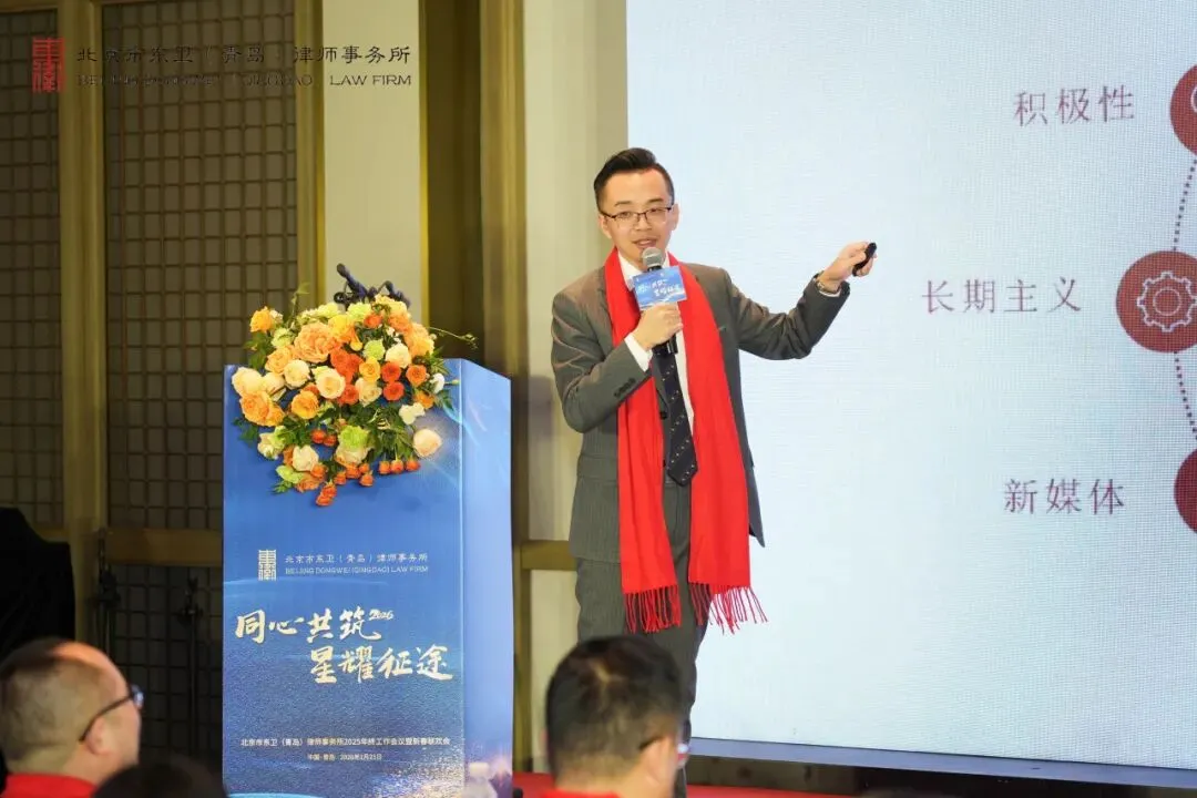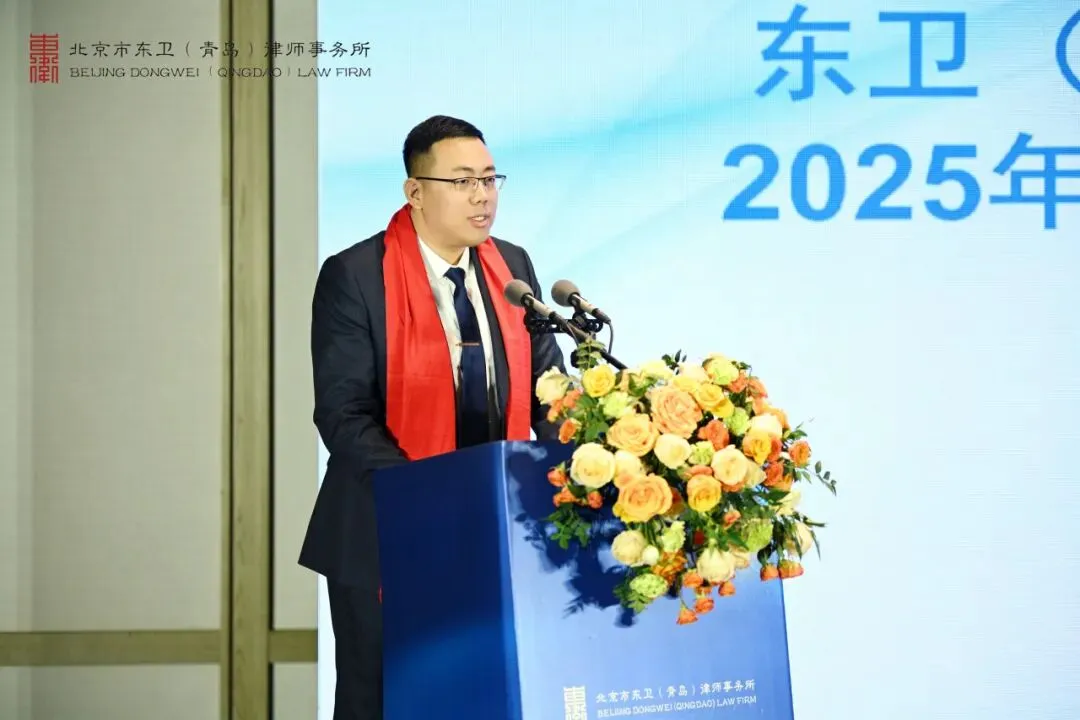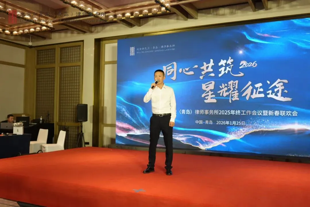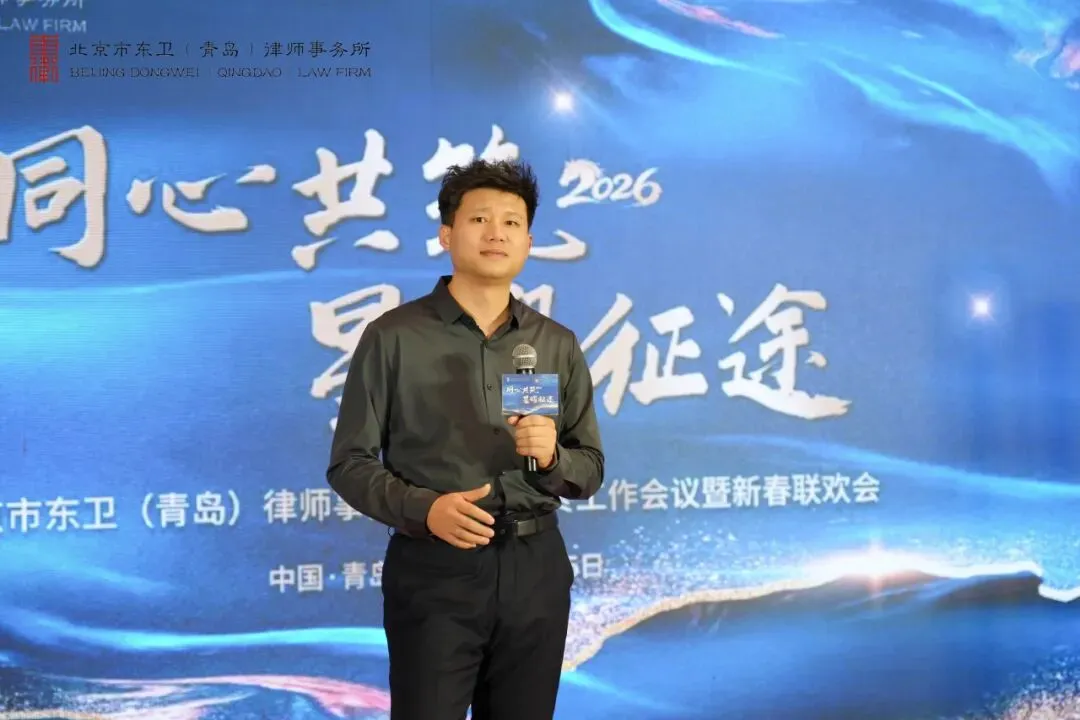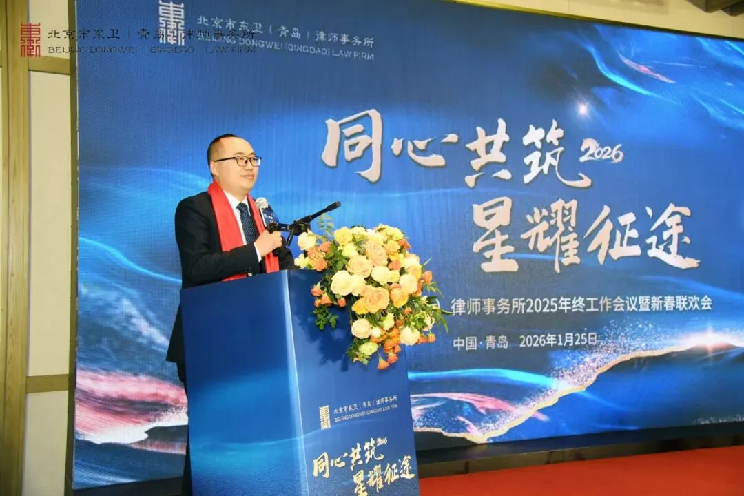 最后,北京市东卫律师事务所管理合伙人、管委会主任毛洪涛律师作总结讲话。毛洪涛主任首先代表总所管理合伙人对东卫青岛所在过去一年取得的成绩表示祝贺。随后,毛洪涛主任全面回顾了东卫青岛发展足迹。他指出,尽管东卫青岛成立时间不长,但已展现出强劲的发展势头:多名律师在省、市两级律师协会的专门和专业委员会任职、专业版图持续扩张,团队建设卓有成效,青年律师培养体系也日趋成熟。他特别强调,东卫青岛要始终坚守 “风清气正” 的立所之本,坚持专业立身、诚信为本。展望 2026 年,毛洪涛主任向全体东卫青岛人提出了更高要求与殷切期望。 他勉励大家以更加积极的态度主动融入东卫平台,勇于打破传统作业惯性,创新市场展业模式。他明确提出,除大部制改革外,2026 年要大力开展内训活动,着力打造具有东卫青岛特色的法律服务产品。毛洪涛主任希望大家在新的一年里,既要提炼过往经验,更要正视自身短板,“彼此欣赏,相互成就”,以清晰的战略方向和坚定的执行力,凝聚全所智慧,共同描绘东卫青岛高质量发展的新蓝图,携手迈向新征程。