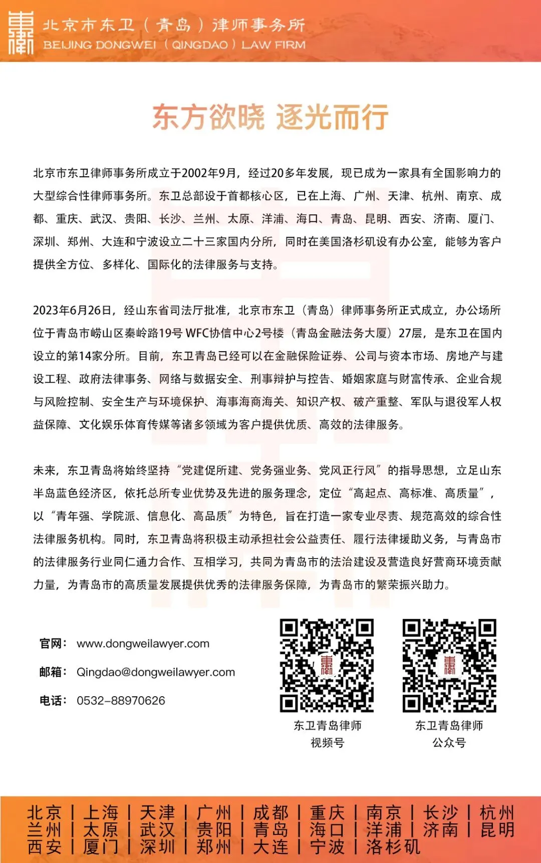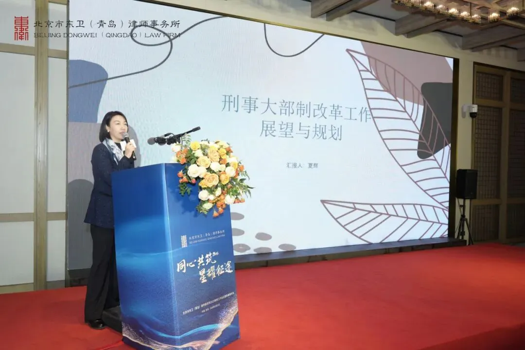 北京市东卫律师事务所管理合伙人、管委会主任毛洪涛律师,高级合伙人、副主任曲建峰律师、苗在超律师,高级合伙人王翠玲、王晓律师受邀出席本次会议,东卫青岛全体人员参加会议,会议由东卫青岛管理合伙人、副主任沈彦敏律师主持。