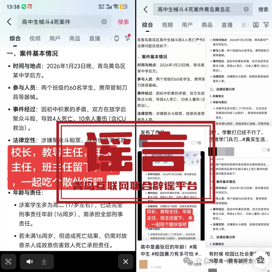 经核实,“青岛黄岛区高中生械斗致4人死亡”“青岛市黄岛区高中生聚众斗殴”等均为虚假消息,青岛市黄岛区并未发生相关案件,系AI技术生成的不实信息。