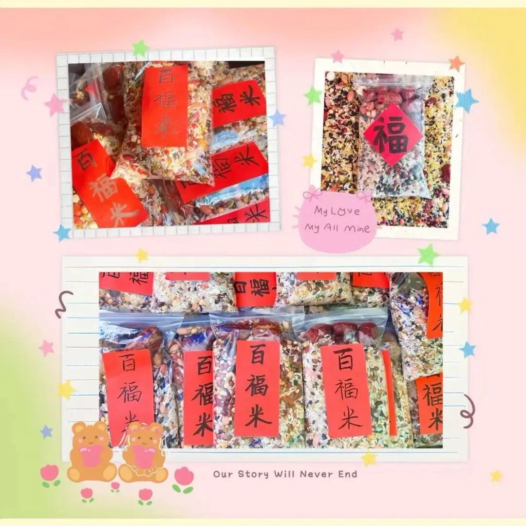 百家米又叫功德米,寓意福寿安康!民间有古话说:“一碗百家米,终身不发愁”。孩子们从家里带上自家的粮食,混在一起又带回,将分享、感恩和满满的福气带回家~。