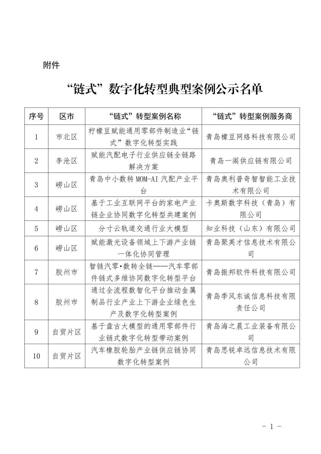 根据《青岛市中小企业数字化转型城市试点工作专项资金管理办法》(青民发字〔2024〕16号)、《关于开展青岛市中小企业数字化转型城市试点“深度改造标杆企业、优秀服务商、中小企业数字化优秀解决方案和产品、‘链式’数字化转型典型案例”申报评选工作的通知》等有关要求,经自愿申报、区(市)初审推荐、答辩评审等程序,现将拟入选青岛市中小企业数字化转型城市试点“‘链式’数字化转型典型案例”名单予以公示。公示期间如有异议,请实名反馈至青岛市民营经济发展局,并提供佐证材料和联系方式,以便核实查证。