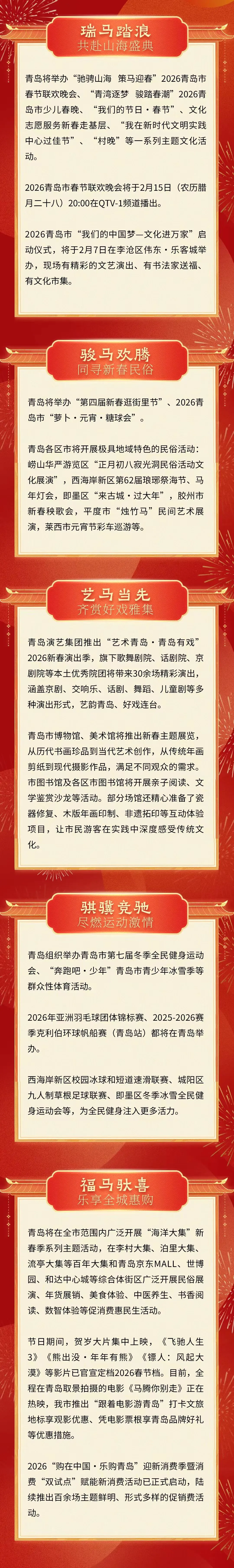 我市将举办“驰骋山海 策马迎春”2026青岛市春节联欢晚会、“青湾逐梦 骏踏春潮”2026青岛市少儿春晚、“我们的节日・春节”、文化志愿服务新春走基层、“我在新时代文明实践中心过佳节”“村晚”等一系列主题文化活动,展现传统与现代交织、民俗与创新融合的节庆魅力。2026青岛市春节联欢晚会将于2月15日,也就是农历腊月二十八,20:00在青岛广播电视台新闻综合频道播出,欢迎大家收看,一同感受青岛年味。2026青岛市“我们的中国梦—文化进万家”启动仪式,将于2月7日在李沧区伟东・乐客城举办,现场有精彩的文艺演出、有书法家送福、有文化市集,向千家万户传递新春美好祝福。位于胶州路108号的青岛手造展销中心将开展“鸥遇青岛”青岛文创体验季,集文化展示、创意互动、消费体验于一体,让大家沉浸式感受传统手造风采。