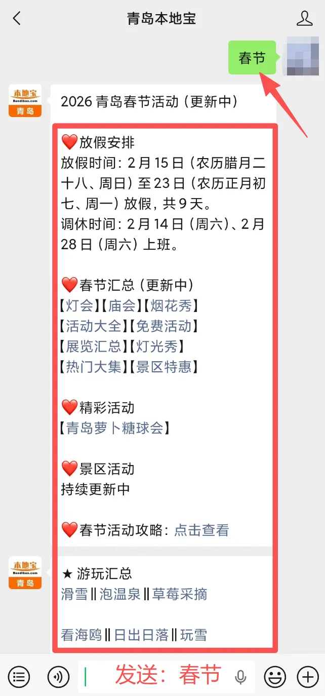 如果大家想了解青岛春节活动可以扫描下方二维码,跳转【青岛本地宝】公众号,在微信对话框回复【春节】关键词,即可获取2026青岛春节活动攻略、春节游玩地推荐、灯光秀等信息!