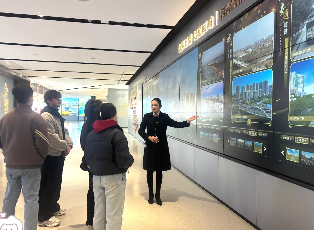 随后,同学们走进黄渤海新区产业文化中心。在产业产品展厅,他们近距离了解新区在化工新材料、汽车制造等领域的特色产业成果;规划展厅内,通过数字沙盘秀、沉浸式数字影像等高科技手段,直观感受新区的过去、现在与未来发展蓝图。在科技艺术体验厅,机械LED矩阵打造的律动新城、全沉浸互动科技演绎的四季更迭,让同学们沉浸在光影艺术的魅力中,纷纷感叹科技为生活带来的无限可能。