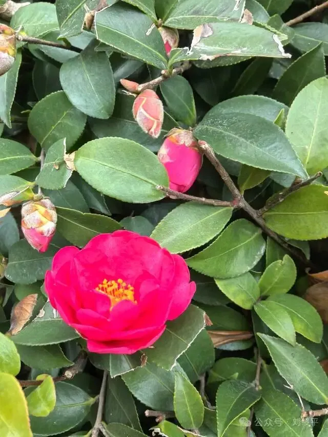 形态特征:常绿小乔木。分枝稀疏,嫩枝有毛;叶革质,椭圆形,上面干后深绿色,发亮,下面褐绿色,无毛;花大小不一,花苞及萼片被柔毛,花瓣阔倒卵形,红色;蒴果球形,种子褐色,无毛;花期11月至次年3月。因其花型兼具了梅花和茶花的特点,故名茶梅。
