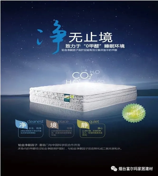 喜临门寝具行业唯一”0甲醛“的铂金净眠技术。喜临门独有的甲醛净化技术——铂金净眠因子,可以在室温分解甲醛;喜临门与欧洲海绵集团合作开发防螨海绵技术,抑制螨虫滋生,防螨抗菌。