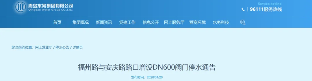 为配合安庆路DN400管道改造工程顺利施工,2026年1月28日22时至次日7时,青岛市市南区宁国路5—17号(单号)、宁国一路7—38号(全部)、宁国二路8—24号(双号)、宁国三路7—20号(全部)、宁国四路8—10号(双号)、安庆路1—17号(单号)、旌德路1—26号(全部)、旌德支路1—12号(全部)、福州北路6号、12号、圣德养老院、银川西路14—36号(双号)等区域将出现停水或降压。