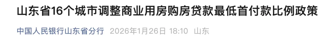 据中国人民银行山东省分行消息,山东省16个城市调整商业用房购房贷款最低首付款比例政策。