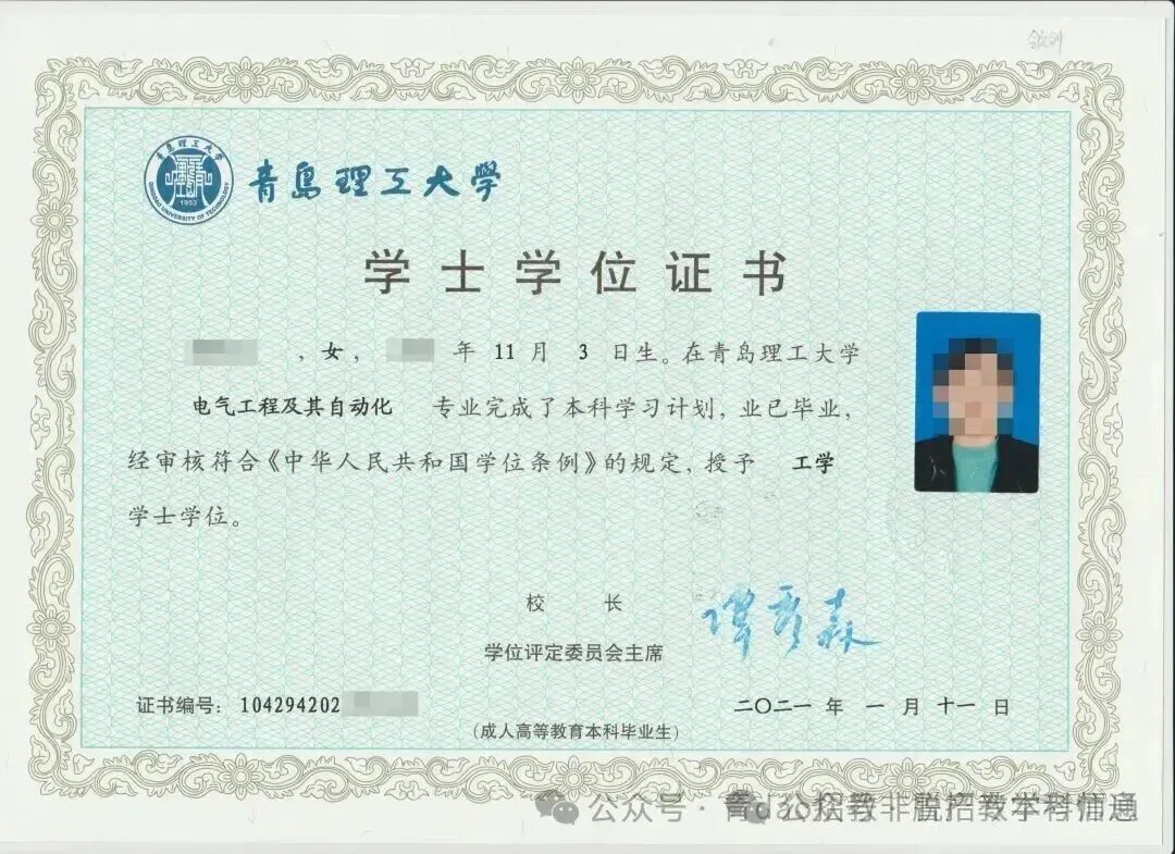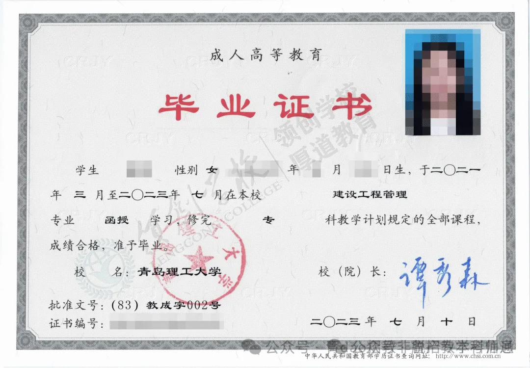 学生在规定的修业年限内完成培养方案的各项要求,经审核准予毕业,学校颁发经教育部电子注册的国民教育系列相应层次的青岛理工大学成人高等教育毕业证书,国家承认学历。本科毕业生符合学位授予条件的可申请学士学位,我校将按有关规定授予相应学科的高等学历继续教育学士学位。