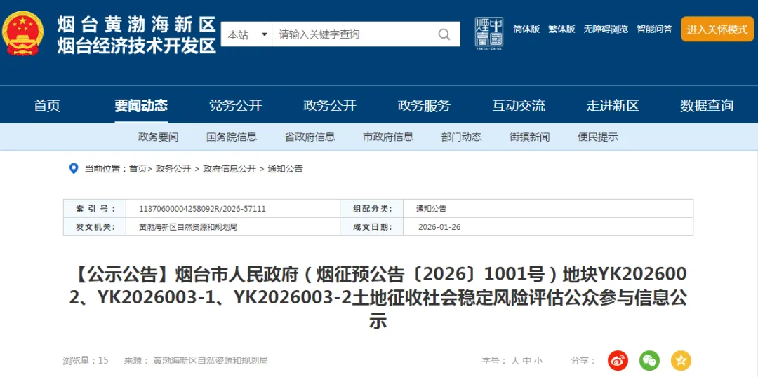 为保障公共利益用地需要,根据《中华人民共和国土地管理法》、《中华人民共和国土地管理法实施条例》和《山东省人民政府办公厅关于规范征收土地管理工作的意见》(鲁政办字〔2022〕13号)等法律法规的规定,经烟台市人民政府研究决定,发布《烟台市人民政府征收土地预公告》(烟征预公告〔2026〕1001号)。县级以上地方人民政府拟申请征收土地的,应当开展拟征收土地现状调查和社会稳定风险评估。按照公开透明原则,现将地块YK2026002、YK2026003-1、YK2026003-2土地征收社会稳定风险评估进行信息公示,征求公众对本征地项目在社会稳定风险评估方面的意见和建议。其中,项目概况如下: