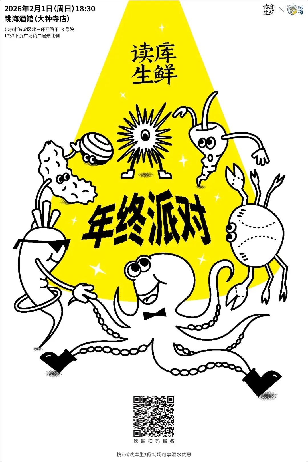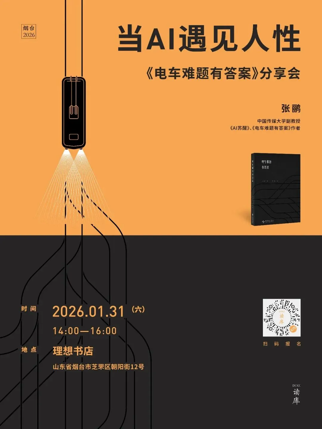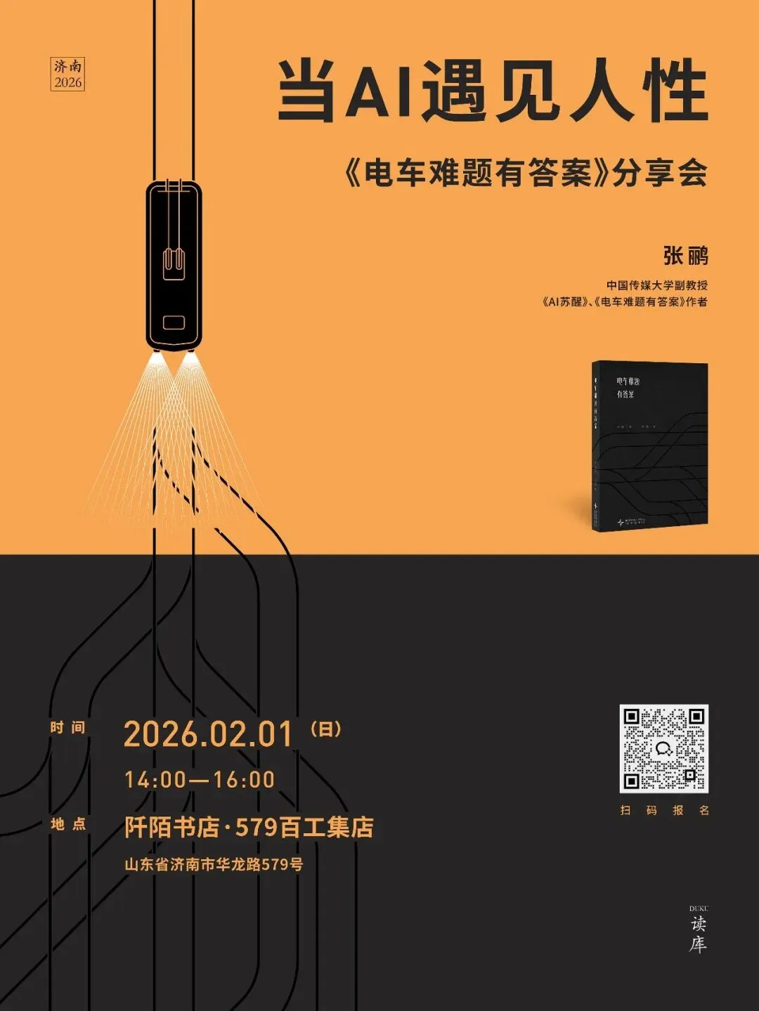 周六烟台,周日济南,《电车难题有答案》作者张鹂将走访两地,和大家聊聊“当AI遇见人性”,拆解 AI 时代的人性困局。周日北京,跳海酒馆,开启读库生鲜年终派对,欢迎大家来玩儿,和我们一起温暖相聚。2026年1月31日(周六)14:00-16:00当 AI觉醒成为悬在人类头顶的达摩克利斯剑,复杂多元的人性也值得重新审视——既有共情、坚守的温暖底色,也有欲望、矛盾的深层肌理。