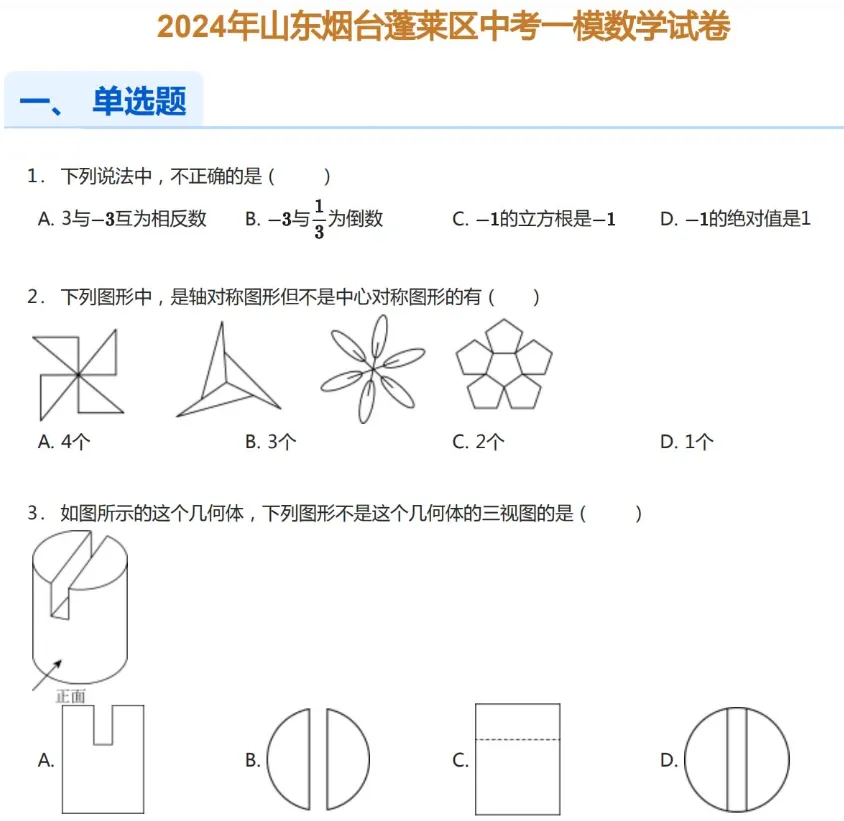 2022-2024年烟台各区初三中考一模数学试卷及答案解析.pdf