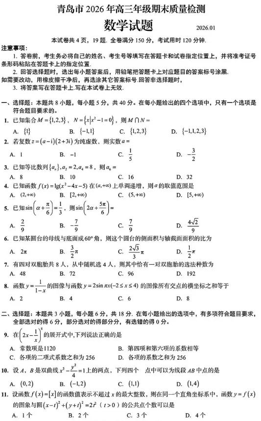 高三数学:八省联考(T8联考)2026届高三12月检测数学试题+参考答案