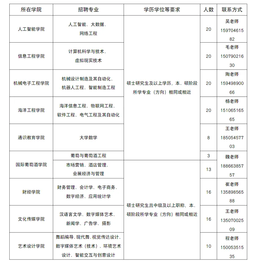 专任教师招聘专业及数量