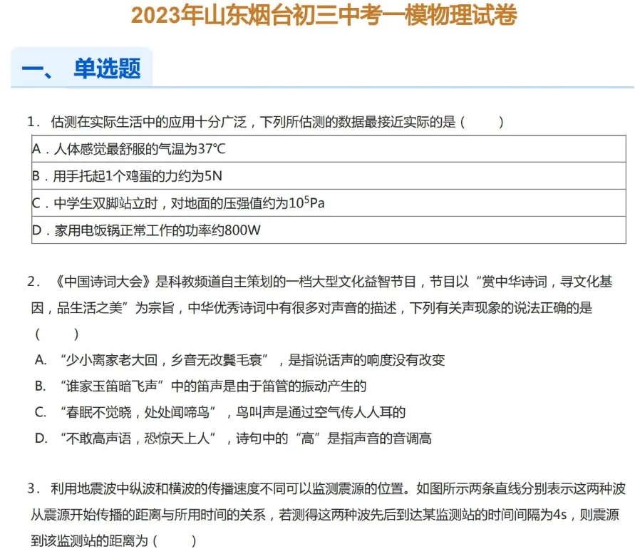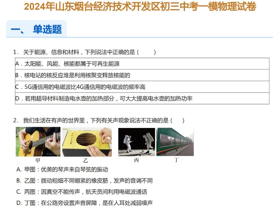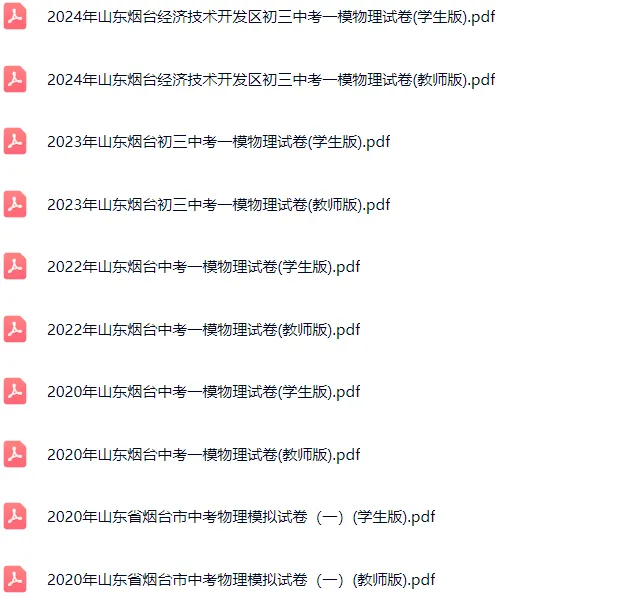 2020-2024年烟台各区初三中考一模物理试卷及答案解析.pdf