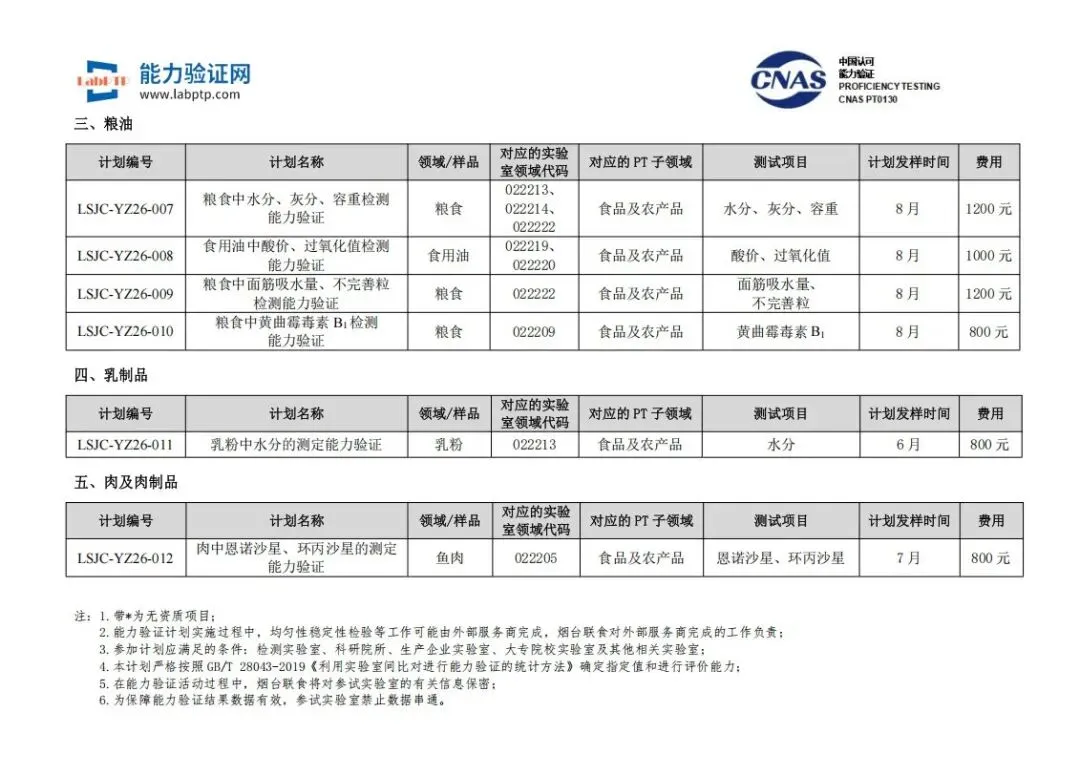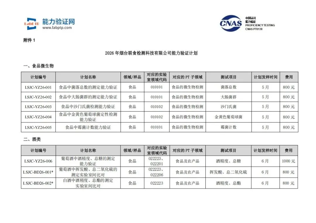 附件: 2026年烟台联食检测科技有限公司能力验证计划