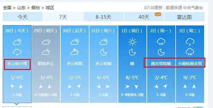烟台市区,28日,多云,偏东风3-4级,最低气温-7℃,最高气温1℃。