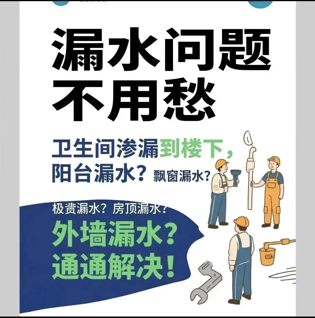 卫生间漏水治理:解决地面渗水、墙面返潮、阴角开裂、下水管周边漏水厨房防水维修:处理橱柜底部积水、洗菜盆周边渗漏、水管连接处漏水阳台防水补漏:修复地漏周边渗水、推拉门下方进水、外墙雨水内渗天花板与墙面:修复楼上漏水导致的损害,处理自家顶面冷凝水潮湿外墙防水维修:修复墙面裂缝、瓷砖空鼓渗水、窗户四周漏水、结构缝渗漏屋顶全面补漏:平顶 / 斜顶渗漏治理、瓦片修复更换、防水层整体重做地下室防潮防水:墙面防潮处理、地面返水堵漏、结构缝及套管密封飘窗与露台:解决接缝处渗水、排水口堵塞、防水层老化失效问题2、快速派单系统智能匹配 300 米内专业防水师傅3、上门勘察2 小时内到达,使用仪器检测,精准定位渗漏源4、方案报价提供书面维修方案与透明价格明细,签约后施工1、检测设备红外热成像仪、湿度检测仪、打压测试设备、内窥镜 ✨2、核心材料高分子防水涂料、自粘防水卷材、快速堵漏剂、结构密封胶3、特色工艺高压注浆加固、背水面防水、整体涂膜防水、节点增强处理4、保障标准严格按国家标准施工,保修期内提供免费维护1、时效保障紧急漏水 10 分钟响应,300 米内优先派单,快速上门 ✨2、质量保障材料环保达标,提供检测报告;施工标准化,环节可验收3、价格保障免费上门检测报价,费用明细清晰,无任何隐形增项4、售后保障局部维修保修 2 年,整体防水保修 5 年;定期回访,建立维修档案暂无评论