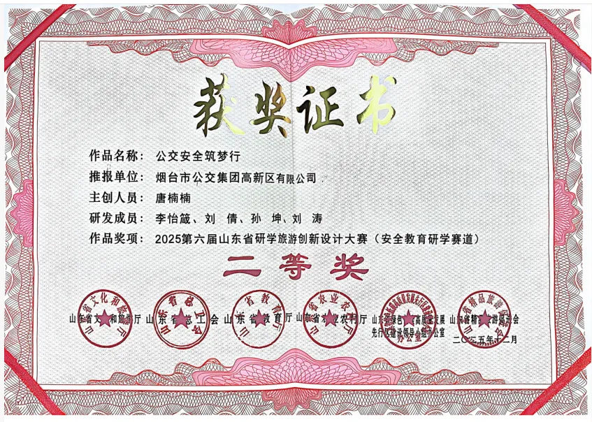 由山东省文化和旅游厅、省总工会、教育厅、农业农村厅、省绿色低碳高质量发展先行区建设领导小组办公室及省精品旅游促进会共同联合主办的“2025第六届山东省研学旅游创新设计大赛”落下帷幕,烟台市公交集团高新区有限公司申报的《公交安全筑梦行》研学课程,凭借鲜明的特色、扎实的内容与创新的设计,经层层评审,最终荣获大赛“安全教育研学赛道”二等奖。