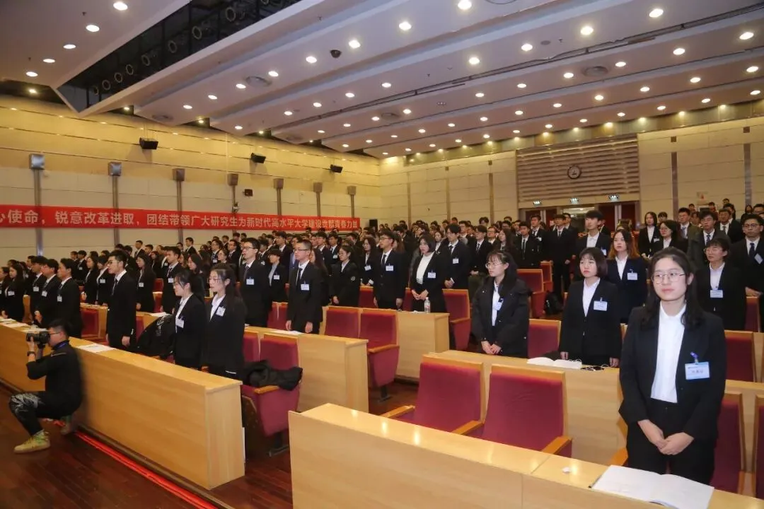 开幕式现场气氛热烈,代表们精神饱满。主席台上方悬挂着“青岛大学第六次学生代表大会/第三次研究生代表大会”的会标,后幕正中是青岛大学校徽,10面鲜艳的红旗分列两侧。会场两侧分别悬挂着“牢记使命砥砺奋进为谱写新时代高水平大学建设新篇章贡献青春力量”、“不忘初心使命锐意改革进取团结带领广大研究生为新时代高水平大学建设贡献青春力量”的横幅。