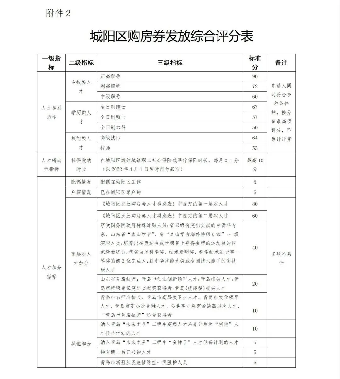第八条 资格排序。购房券发放实行综合评分制,发放顺序按照《城阳区购房券发放综合评分表》(附件 2)各项分值合计,分数高者优先发放。分值相同的按照在青缴纳社保或医保时长排序,时间长者优先;社保或医保缴纳时长相同的,按照申请人年龄排序,年龄大者优先。