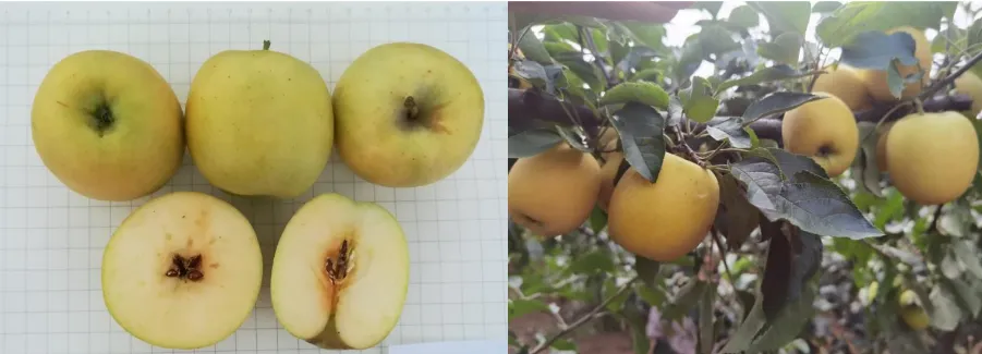 原产澳大利亚,烟台少量引种种植,果皮鲜亮翠绿色,果肉硬脆致密,高酸高糖(糖度 12-14°,酸度 > 0.8%),酸甜对比强烈,10 月下旬成熟,耐储运性极佳,是优质的鲜食加工兼用型品种,特别适合制作果汁、果酱和烘焙食品,目前在烟台主要作为科研种质资源保存。烟台核心经典怀旧老品种,中国传统苹果品种,烟台为主要产区之一,10 月上中旬成熟。果形扁圆、果顶平,果形扁圆、果顶平。果皮青黄相间(成熟后青绿泛黄),果面有少量果锈,核心特征是带有浓郁的香蕉清香,辨识度极高;果肉黄白色,肉质细脆多汁,酸甜适口(甜为主,带微酸),耐贮性优异,自然贮藏可至次年 3-4 月,贮藏后果香更浓、口感更绵;因果形不够规整、果面易有锈斑,未大面积推广,目前仅烟台小众老果园保留种植,是烟台本土老苹果的代表。虽然烟台苹果目前仍以富士系苹果为主,但近年维纳斯黄金、瑞香红、烟香玉等特色品种种植面积逐年扩大,形成 “早中晚、红黄绿” 的多元格局,同时本地还保留着红香蕉、青香蕉等承载一代人记忆的经典老品种,小众种植、风味独特。早熟黄色免套袋苹果新品种烟香玉的选育 孙燕霞 1,宋来庆 1,赵玲玲 1,张学勇 1,刘大亮 1,赵 俊 2,刘学卿 1,唐 岩 1* ( 1山东省烟台市农业科学研究院,山东烟台265500; 2西藏自治区林木科学研究院,拉萨850000) 果树学报2022,39(3):499-501……