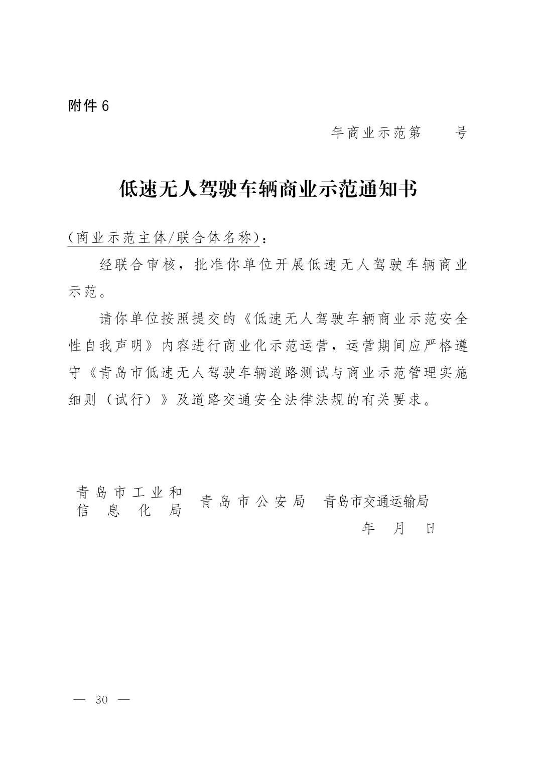 青岛市低速无人驾驶车辆道路测试与商业示范管理实施细则(试行)