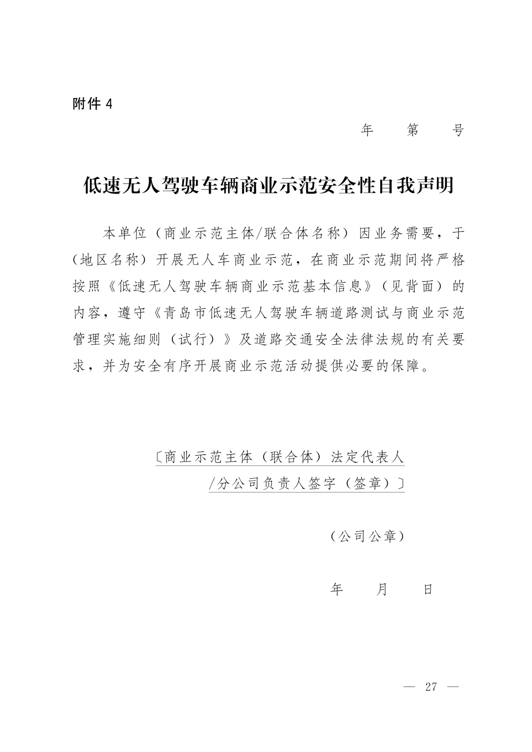 (五)无人车商业示范安全性自我声明(附件4);
