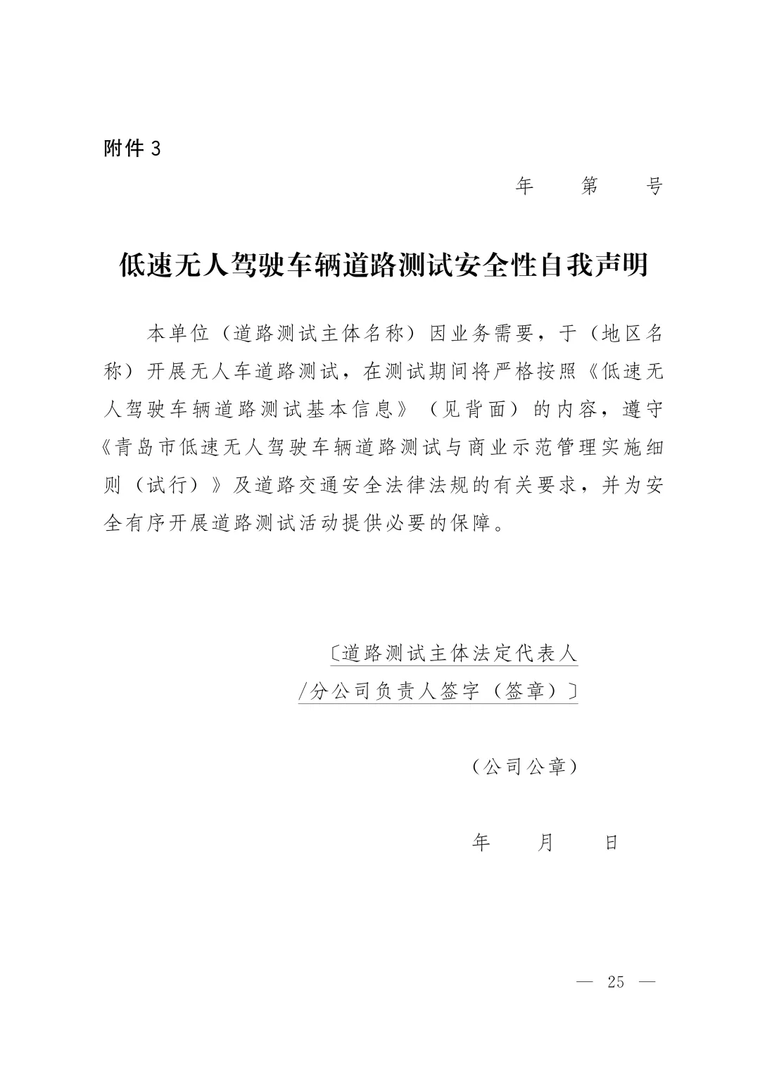 (九)无人车道路测试安全性自我声明(附件3)。
