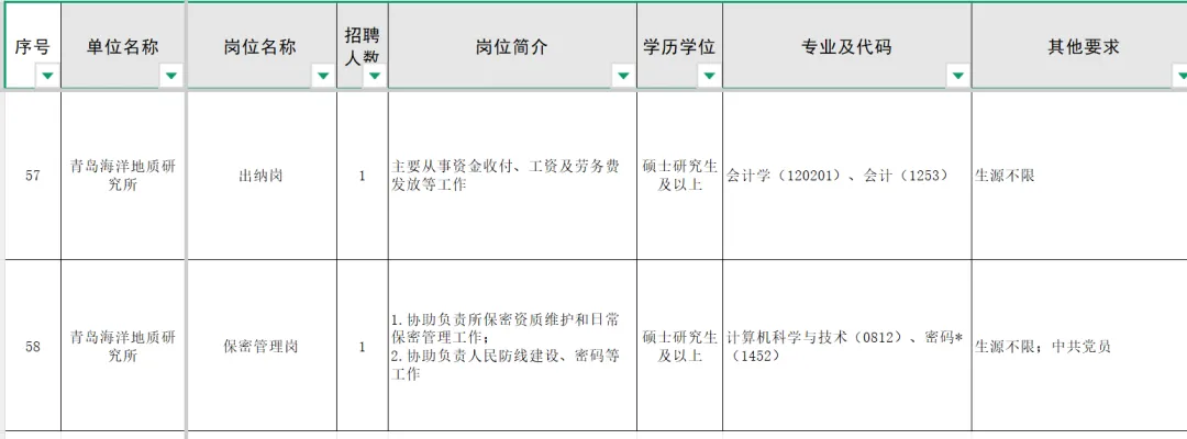 中国地质调查局是自然资源部管理的副部级单位,下辖43家事业单位,负责统一部署和组织实施国家基础性、公益性、战略性地质和矿产勘查工作,承担能源和矿产调查、水文地质与水资源调查、环境地质调查、工程地质调查、海洋地质调查和自然资源调查,支撑服务国土空间规划、用途管制、生态保护修复等职责,为国民经济、社会发展和生态文明建设提供地质基础信息资料,并向社会提供公益性服务。根据工作需要,按照事业单位公开招聘有关政策规定,现开展中国地质调查局局属单位2026年度第一批公开招聘工作。1.2026年国内高校应届毕业生(含两年择业期内未落实工作单位的高校毕业生,不含定向生、委培生,在校期间及两年择业期内没有社保缴存记录);近两年内(截至入职前)获得国家认证的国(境)外学历,且没有工作经历的留学回国人员。年龄38周岁以下(1987年1月1日后出生)。2.具有相关工作经历的社会人员(含2026年出站的博士后)。年龄38周岁以下(1987年1月1日后出生)。博士学历学位应聘人员可放宽至40周岁(1985年1月1日后出生),专业技术中级岗位招聘年龄可放宽至40周岁(1985年1月1日后出生),专业技术高级岗位招聘年龄可放宽至45周岁(1980年1月1日后出生)。参加本次公开招聘的单位共42家,其中在京单位13家、京外单位29家,招聘岗位574个,招聘714人。其中,应届毕业生岗位427个,招聘555人;社会人员岗位147个,招聘159人。具体招聘岗位见《中国地质调查局局属单位2026年度公开招聘岗位信息表(第一批)》(见附件1-4)。中国地质调查局局属在京单位京外生源岗位不参加本批次招聘。(二)拥护中华人民共和国宪法,拥护中国共产党领导和社会主义制度,具有良好的政治素质和道德品行,增强“四个意识”、坚定“四个自信”、做到“两个维护”,在思想上政治上行动上同以习近平同志为核心的党中央保持高度一致,热爱中国共产党、热爱祖国、热爱人民。(六)应届毕业生须于2026年12月31日前取得毕业证、学位证。留学回国人员须于入职前获得国(境)外学历学位,并取得教育部留学服务中心出具的学历学位认证书。博士后人员须于2026年12月31日前办理完成出站手续。(七)符合国家有关部门和招聘单位驻地关于接收高校应届毕业生或社会人员的有关规定。报考在京单位京内生源应届毕业生岗位须具有北京市常住人口户籍(不含北京高校集体户)。报考在京单位社会人员岗位须具有北京市常住人口户籍,或为符合北京市落户政策的2026年出站博士后。3.曾在各级公职人员招考中被认定有舞弊等严重违反考试录用纪律行为,还在禁考期的;1.报名时间。公告发布之日起至2026年3月4日17:00。2.报名方式。请于报名期限内登录“中国地质调查局所属事业单位公开招聘平台”(网址:http://www.sydwgkzp.cn/cgs/,推荐使用Chrome、火狐浏览器登录),仔细阅读注意事项,按照系统要求浏览招聘岗位并选择报名。本批次招聘中,每名应聘人员仅可报考一个岗位。(1)应聘人员须在报名时签署诚信承诺书(见附件5),承诺所提供的信息真实准确,并承担不实承诺相关责任。应聘人员与报考单位工作人员有亲属关系的,应在报名时主动报告。(2)应聘人员以已取得的最高学历报考(应届毕业生以即将取得的最高学历报考),且最高学历所学专业与岗位要求专业相符。(3)应聘人员须在报名截止日前,完成资料提交、资料补充,逾期未对审核反馈意见进行补充的,视为放弃报名。各局属单位对报名本单位人员的资格条件进行审查,通过资格审查人员名单在各局属单位门户网站发布。通过资格审查人数原则上不得低于该岗位拟招聘人数的5倍,若不满足要求,由各局属单位党委集体研究决定是否按照实际通过资格审查的人数组织考试。(1)统一笔试岗位。统一笔试岗位笔试由中国地质调查局统一组织,采用百分制,合格分数线60分,主要测试内容为综合能力和写作能力。应聘人员须在报名系统上进行参加笔试确认,逾期视为放弃此次笔试。统一笔试时间及具体安排等事宜另行通知,请密切关注中国地质调查局及各局属单位门户网站。(2)自主招聘岗位。设置笔试环节的自主招聘岗位,笔试由各局属单位自行组织,采用百分制,合格分数线、主要测试内容等由各局属单位自行确定。笔试有关安排及要求等事宜以各局属单位发布的笔试通知为准,请密切关注各局属单位门户网站。2.面试。通过笔试合格分数线的应聘人员,每个岗位按照1:5的比例和笔试成绩由高到低的顺序确定面试人选。面试人选少于规定比例人数的岗位,按通过笔试合格分数线的实际人数开展面试。若某岗位有考生主动放弃面试机会,则按该岗位笔试成绩由高到低依次递补。如遇末位同分情况,一并进入面试。仅设置面试环节的岗位,通过资格审查人员作为面试人选,若通过资格审查人数无法形成有效竞争关系,由各局属单位党委研究是否按实际人数进行面试。面试人员名单在各局属单位门户网站发布。面试采用百分制,合格分数线见各岗位要求。面试有关安排及要求等事宜以各局属单位发布的面试通知为准,请密切关注各局属单位门户网站。设置笔试和面试环节的岗位,综合成绩按笔试成绩×所占百分比+面试成绩×所占百分比计算,笔试、面试成绩占比见各岗位要求。仅设置面试环节的岗位,面试成绩即为综合成绩。通过面试合格分数线的应聘人员,按照综合成