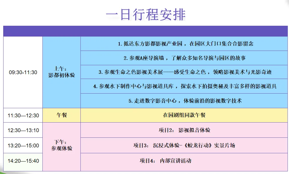 • 费用包含:车费、研学导师费、场地参观费、剧组午餐费、保险费等(不含个人消费)