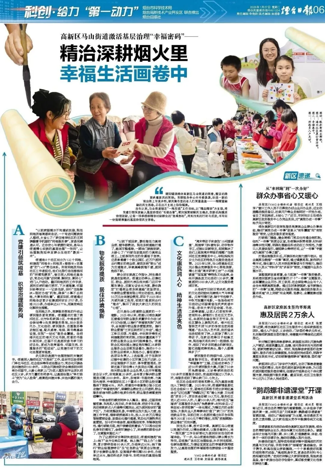 暖阳铺洒烟台高新区马山街道的街巷,整洁的路面映着居民的笑脸。党群服务中心内书香袅袅,改造一新的商业街上车流井然,便民集市里的老人们笑意盈盈——一幅暖意融融的民生画卷,正在这片片土地上徐徐铺展。