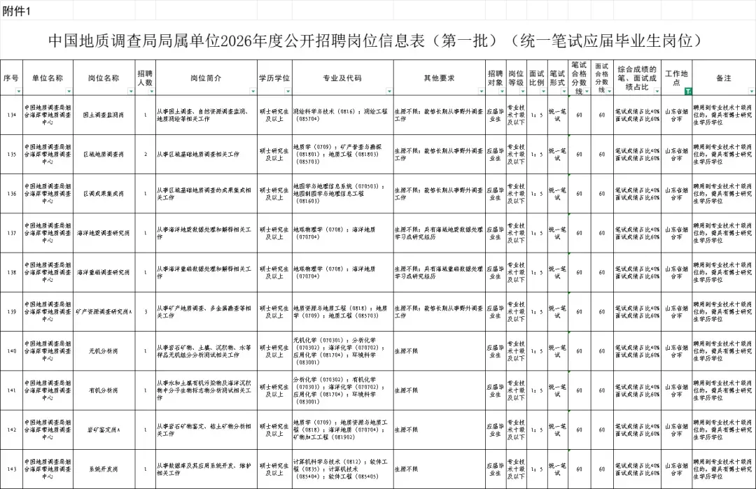 具体招聘岗位见《中国地质调查局局属单位2026年度公开招聘岗位信息表(第一批)》(见附件1-4)。中国地质调查局局属在京单位京外生源岗位不参加本批次招聘。