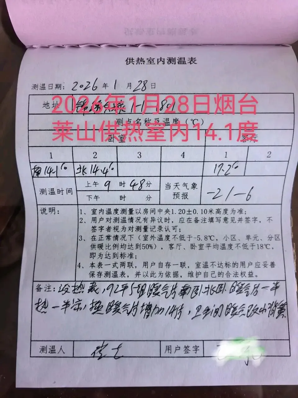 近日,烟台莱山区遭遇历史级寒潮,最低气温跌破-21℃。然而比天气更冷的,是不少业主的心——有居民实测家中室温仅14.1℃,北卧室14.4℃,客厅勉强达到17.2℃,暖气片更是“一半热一半凉”,完全达不到《烟台市供热管理办法》规定的18℃标准。