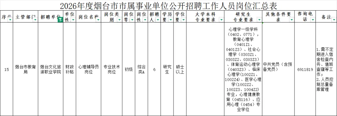 烟台文化旅游职业学院是经山东省人民政府批准、烟台市人民政府主办的专科层次全日制公办普通高等学校。根据事业单位公开招聘有关规定,结合市属事业单位岗位空缺情况和工作需要,现将2026年度市属事业单位公开招聘工作人员有关事项公告如下: