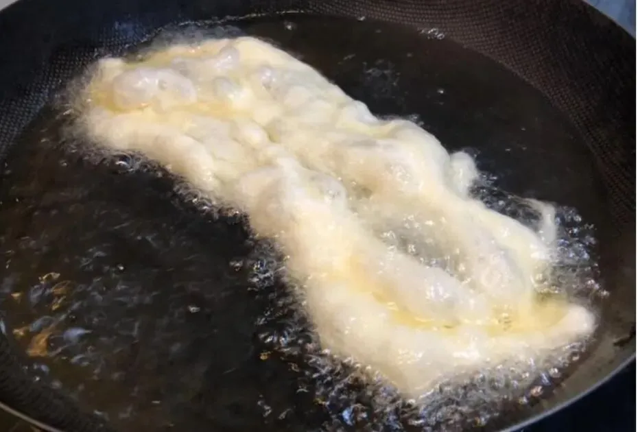 炸好的面鱼长约30厘米,厚约3厘米,外表金黄,蓬松柔软,口感外酥里嫩、香软绵细,且因发酵易于消化。