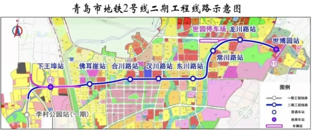 2号线二期起于李村公园站(不含),止于世博园站,线路总长8.9公里,共8站10区间,主要服务李沧东片区、院士港等区域。