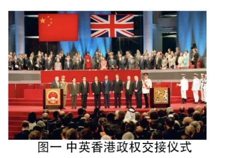 根据材料信息,图一反映的是中英香港政权交接仪式,图二反映的是中葡澳门政权交接仪式,反映我国近代史上被割让的香港澳门地区正式回到祖国的怀抱。结合所学知识,第一次鸦片战争后英国强占香港岛,《中葡会议草约》和《中葡和好通商条约》割让了澳门给葡萄牙,澳门香港的回归,反映出中国国际实力和国际地位的提升,是中国反对侵略伟大斗争的胜利;新中国成立后,党把完成祖国统一大业作为历史重任,为此进行不懈努力,邓小平创造性提出“一个国家,两种制度”科学构想,开辟了以和平方式实现祖国统一的新途径,经过艰巨工作和斗争,我国政府相继对香港、澳门恢复行使主权,香港、澳门回归祖国后,中央政府严格按照宪法和特别行政区基本法办事,保持香港、澳门长期繁荣稳定;澳门香港的回归洗雪了中华民族百年耻辱,完成了实现祖国完全统一的重要一步,是中国共产党对于中华民族的历史性贡献,是彪炳中华民族史册的千秋功业,为国际社会解决类似问题提供了一个新思路新方案,是中华民族为世界和平与发展作出的新贡献。
