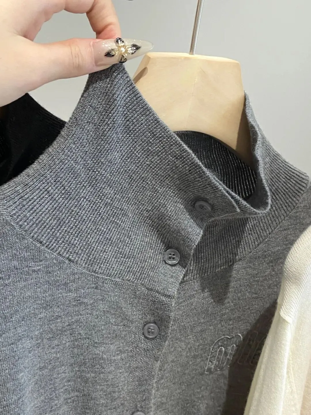 领口也是蛮独特,可以把纽扣扣起来当成立领样式