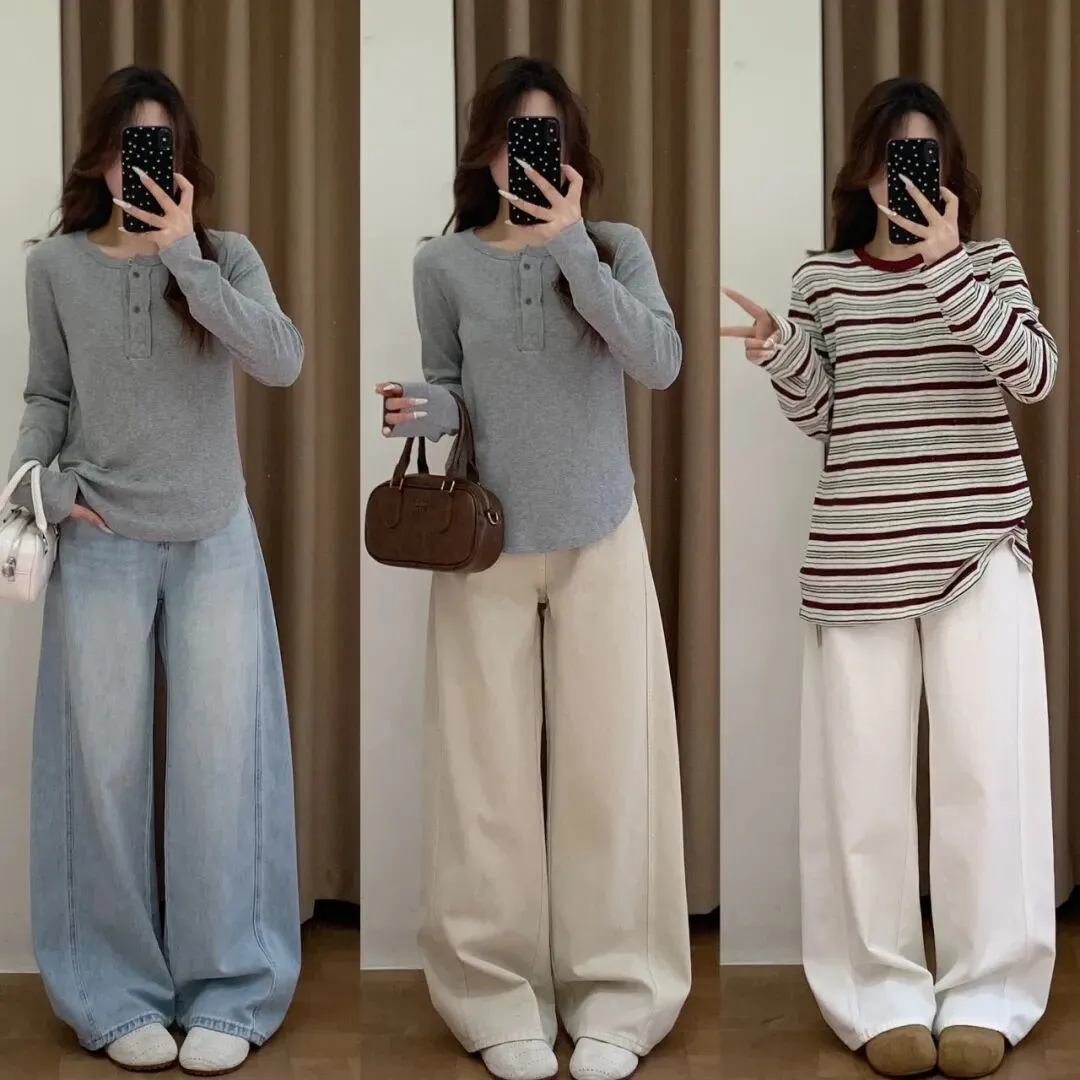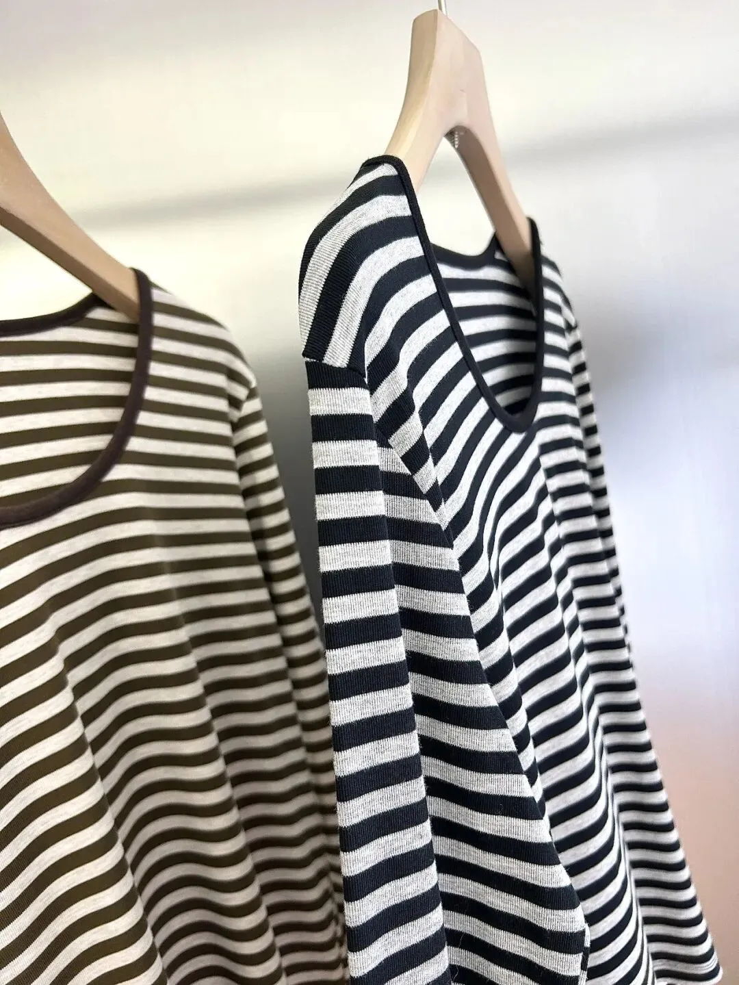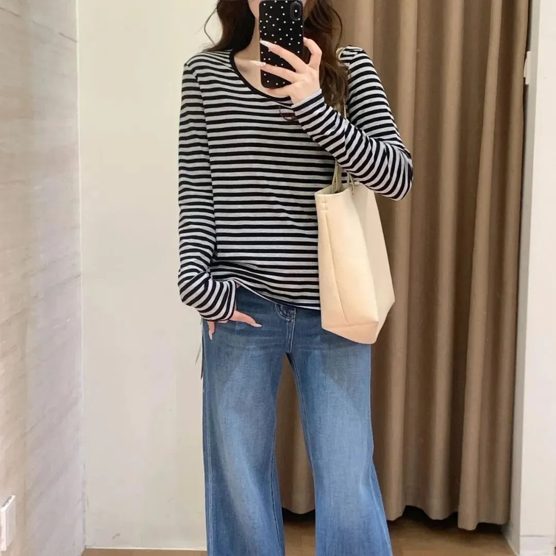 【淘宝】 https://e.tb.cn/h.7qWxOn0MPEXvd12?tk=sHvTUSuESFc CZ009 「IN BLUE 26年早春新款95莱赛尔混纺显瘦大U领弹力条纹长袖打底T恤」