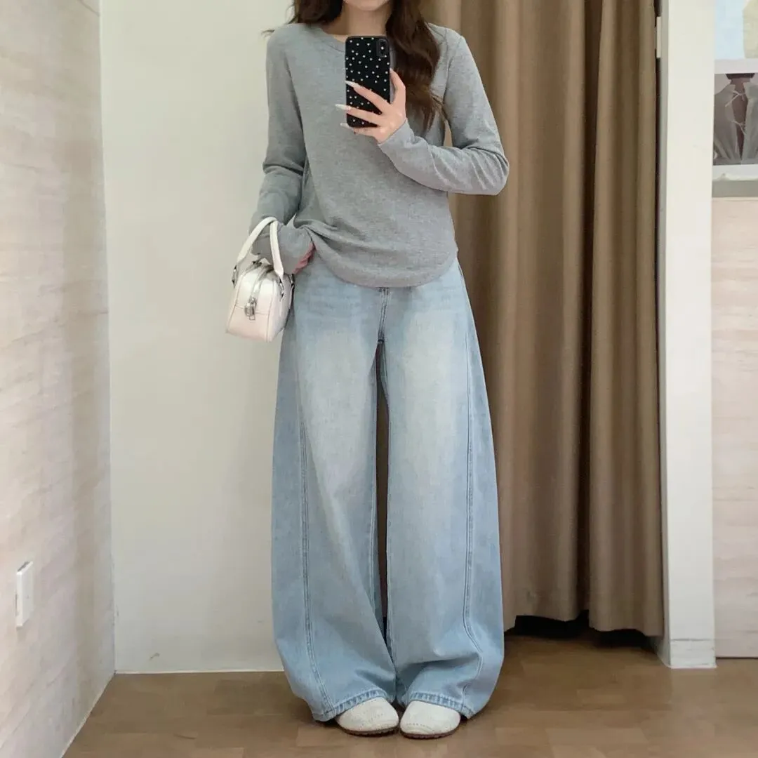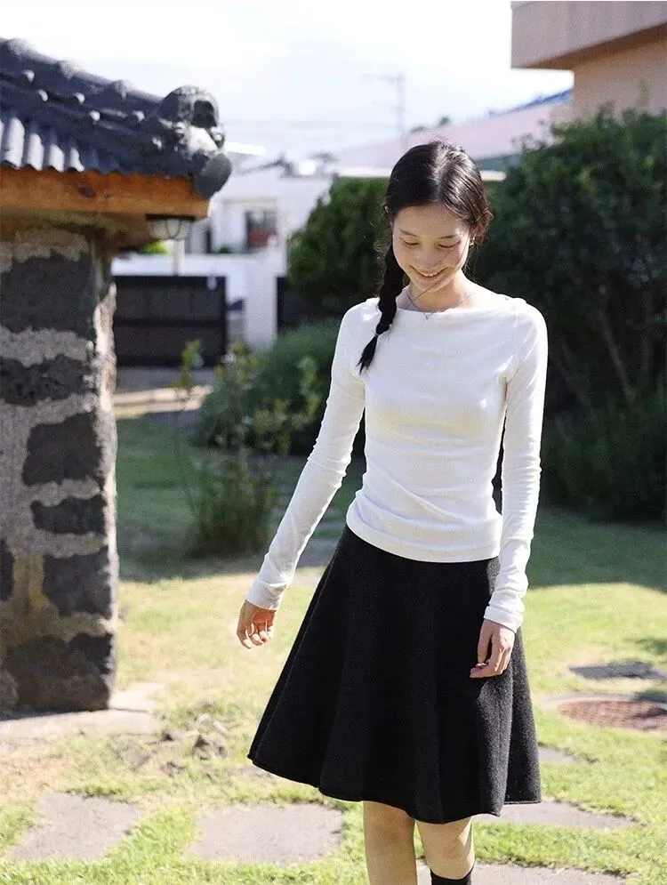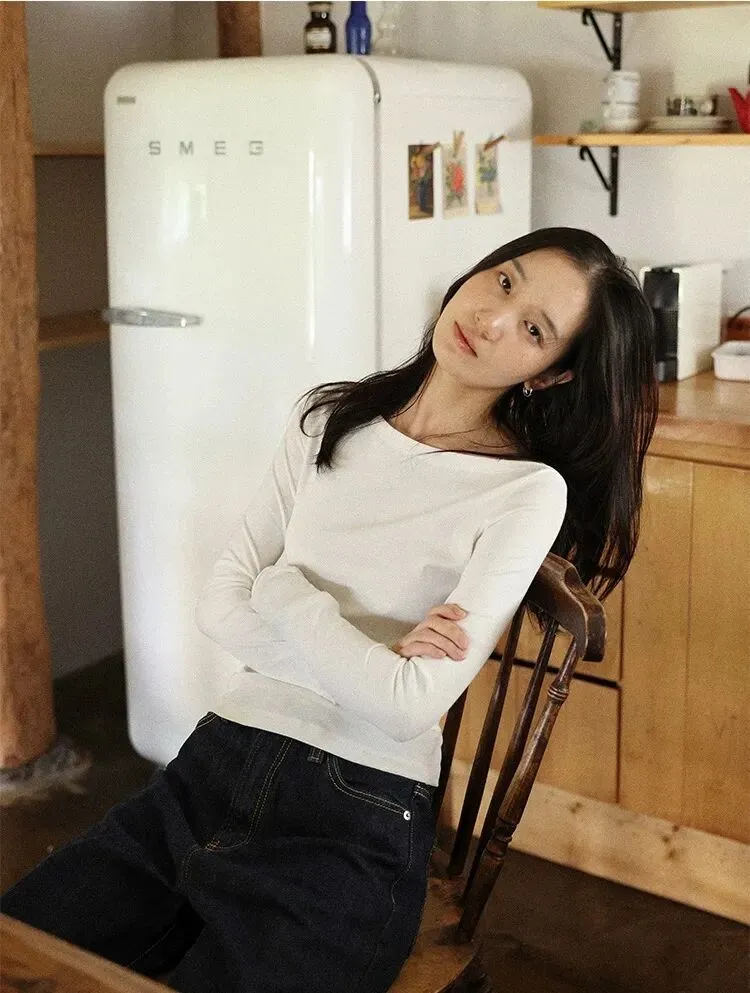 【淘宝】 https://e.tb.cn/h.7JcwQyfnjm5CM6C?tk=BlN5USuyZzI CZ356 「IN BLUE 26年早春新款韩系修身显瘦95棉混纺船领纯色打底衫T恤女」