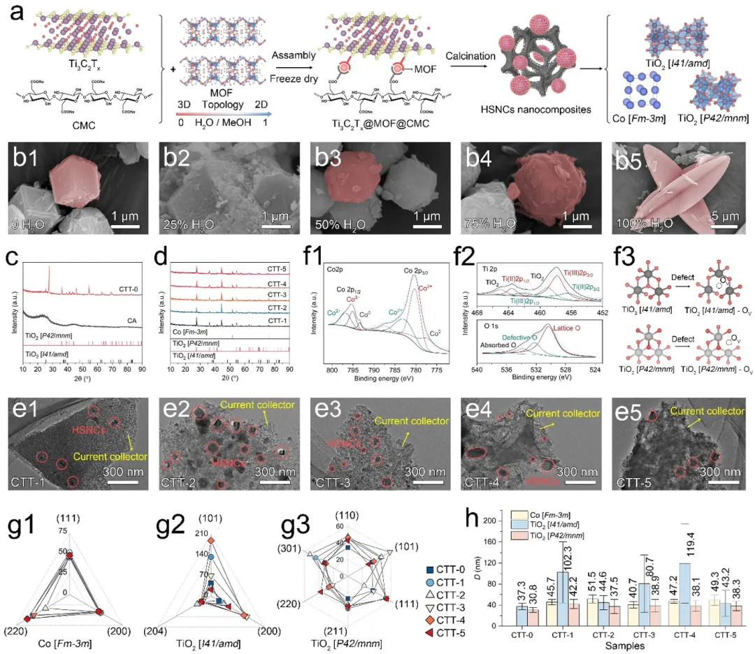 图1. a) HSNCs纳米复合材料配位辅助静电自组装示意图。ZIFs在混合溶剂中沉积的SEM图像,其中b1) 0 H2O,b2) 25% H2O,b3) 50% H2O,b4) 75% H2O和b5) 100% H2O。c) CA 和CTT-0的XRD图谱,以及d) CTT-1、CTT-2、CTT-3、CTT-4和CTT-5的XRD图谱。e1) CTT-1、e2) CTT-2、e3) CTT-3、e4) CTT-4和e5) CTT-5的TEM图像。f1) CTT-4的Co 2p、f2) Ti 2p和O 1s XPS峰。f3) TiO2中OV结构的示意图。沿代表性晶面的颗粒尺寸(g1)Co[Fm-3m]、g2)TiO2[I41/amd]和g3)TiO2[P42/mnm]。h)所有样品中各相的平均粒径。