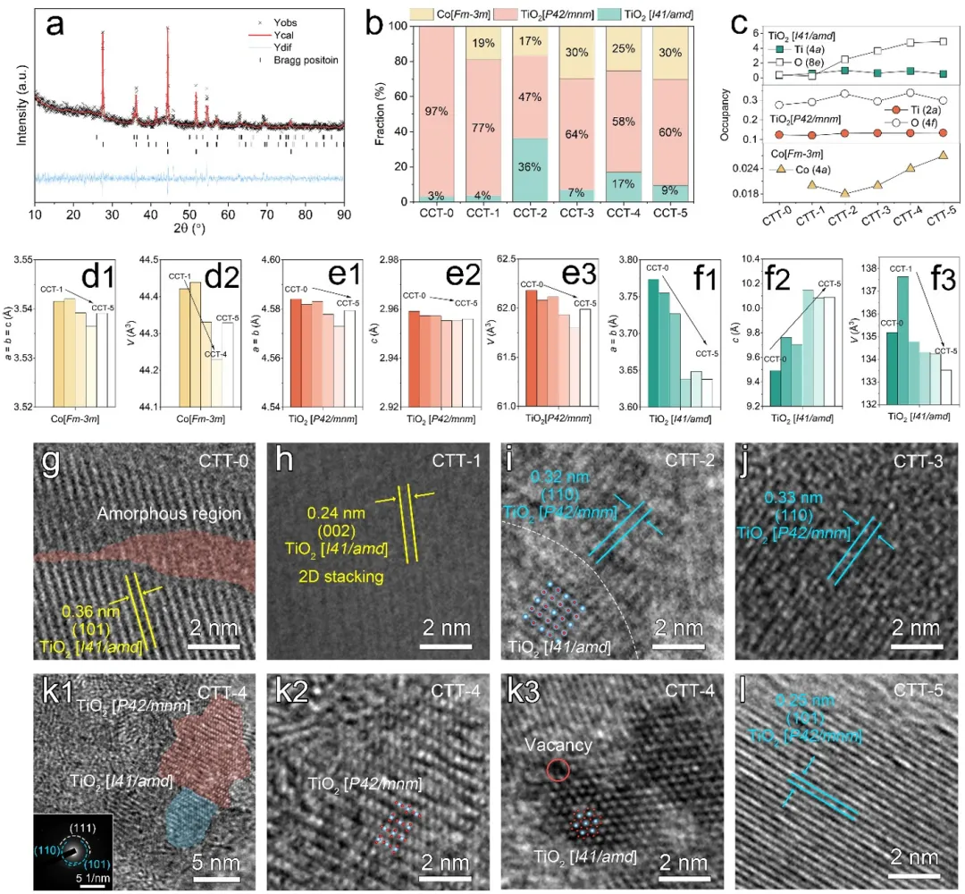 图2. a) CTT-4的XRD Rietveld精修结果。b) HSNCs中各相的质量分数。c) HSNCs中各晶相的原子占位率。d) Co[Fm-3m]晶胞的晶格常数和V值。e) TiO2[P42/mnm]晶胞的晶格常数和V值。f) TiO2[I41/amd]晶胞的晶格常数和V值。g) CTT-0,h) CTT-1,i) CTT-2,j) CTT-3,k1-k3) CTT-4和l) CTT-5的高分辨透射电镜(HRTEM)图像。
