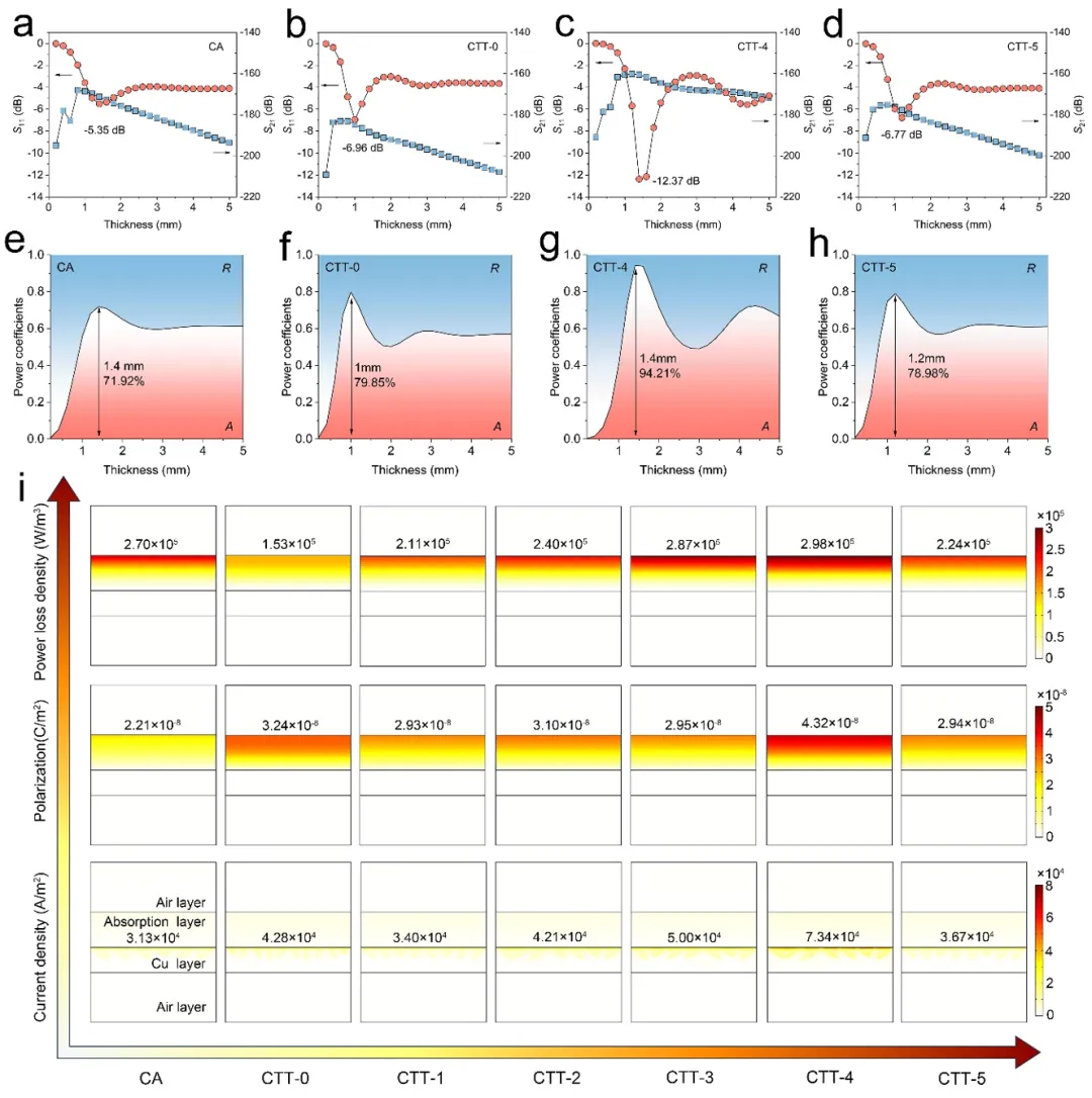 图 4. a) CA、b) CTT-0、c) CTT-4 和 d) CTT-5的仿真S参数。e) CA、f) CTT-0、g) CTT-4和h) CTT-5的仿真功率系数。所有具有1.4 mm吸收层的样品的仿真电流密度、极化强度和功率损耗密度。