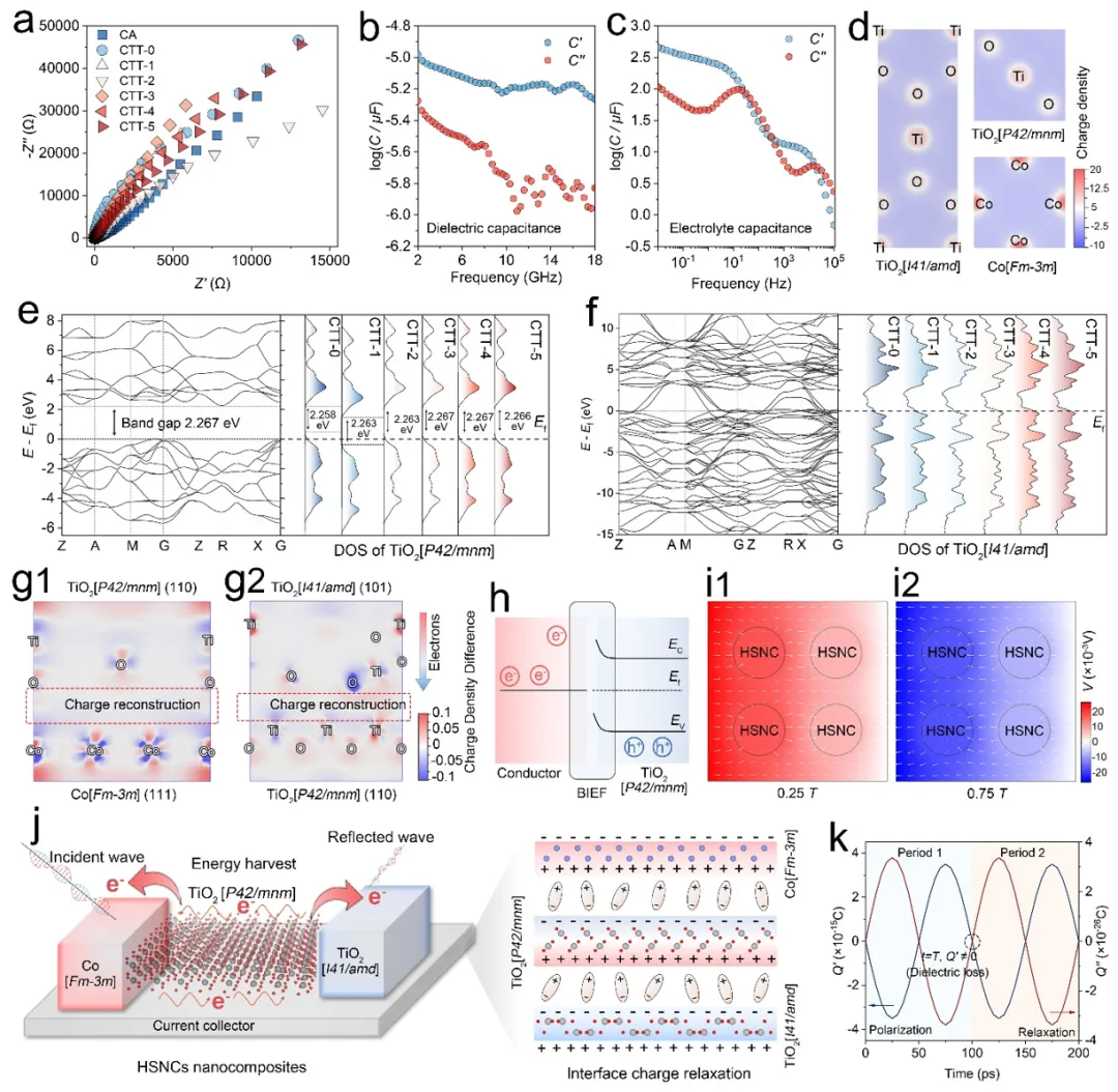 图 5. a)所有样品的Nyquist图。b) CTT-4的介电电容和c) CTT-4的电解质电容。d) CTT-4的电荷密度图像。e) TiO2[P42/mnm]和f) TiO2[I41/amd]的能带结构和所有异质纳米复合材料的态密度。g1) Co[Fm-3m]/TiO2[P42/mnm]界面和g2) TiO2[I41/amd]/TiO2[P42/mnm]界面的差分电荷密度。h) 异质界面中能带排列和电子重新分布的示意图。i1) 0.25T和i2) 0.75T下CTT-4的电势和电场分布。j) 异质纳米复合材料的无线电力响应和空间电荷弛豫机制示意图。k) 端子电荷的动态变化。
