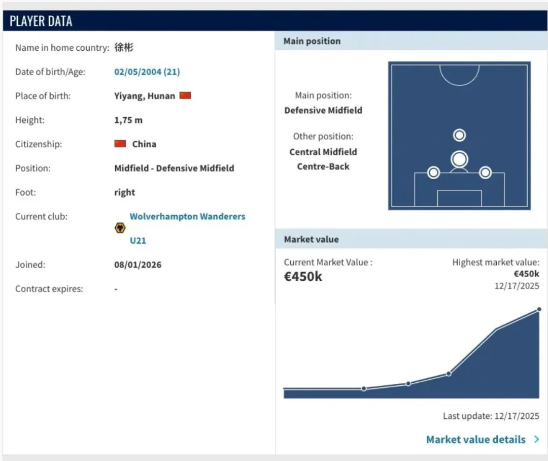 1月29日,据五星体育消息:德国转会市场(Transfermarkt)更新信息,U23国足队长、青岛西海岸中场徐彬已经成为狼队U21球员。
