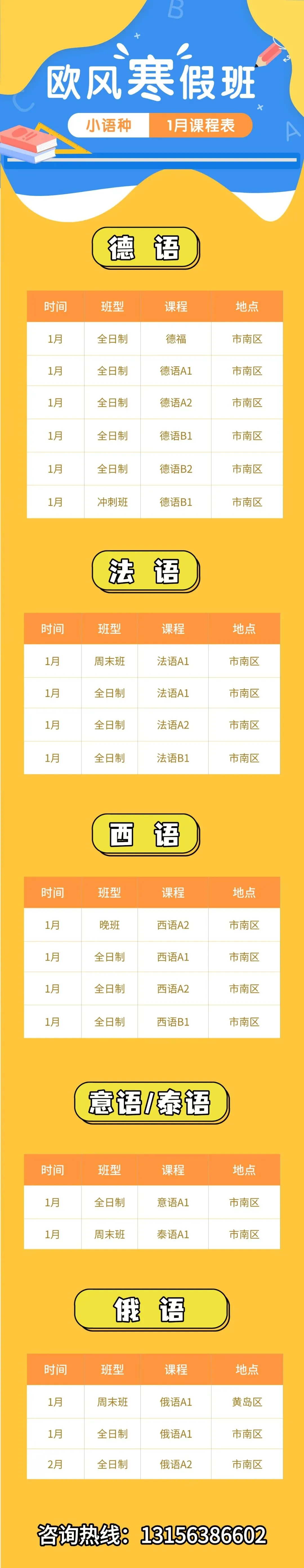 想了解更多德语、法语、西语、俄语、意语、日语、韩语等小语种寒假课程,欢迎拨打电话13156386602进行咨询~