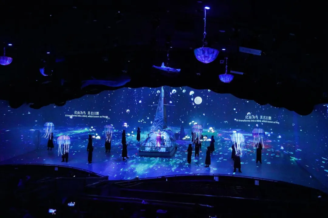 270度全视域影像将观众全方位包裹其中,多自由度动感座椅随剧情精准模拟航行途中的颠簸起伏。当灵动的机械水母从天幕缓缓降下,巨型遥控大鲲在观众头顶盘旋遨游,剧场内瞬间响起阵阵惊叹,沉浸式的海洋幻境就此铺展。