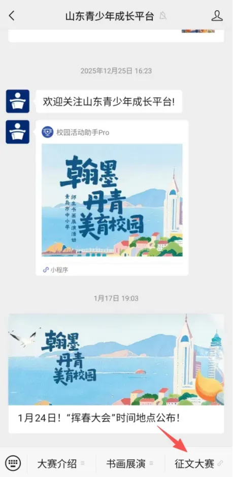 第一步:微信搜索“山东青少年成长平台”,关注进入页面,点击右下角征文大赛。